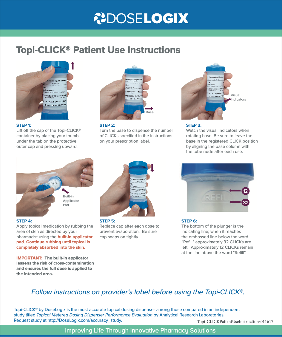 All Nimbus prescription creams come in a Topi-CLICK dispenser, which makes it easy to apply the correct amount. Simply twist the bottom of the container until you hear the number of clicks specified on your label.